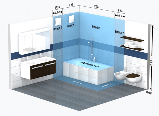 Darstellung der verschiedenen Sicherheitszonen, welche beim Einbau eines Ventilators in einer Nasszelle zu berücksichtigen sind.